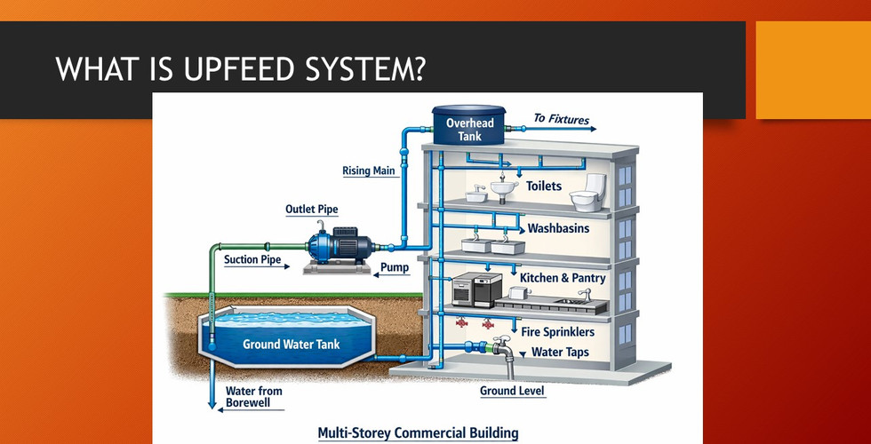 An UPFEED water system delivers water from the main supply directly to each floor or zone in a building. Unlike traditional gravity-fed or booster pump systems, the UPFEED system pumps water upward through vertical risers, maintaining steady pressure throughout the building. This design is especially useful in commercial buildings where water demand varies by floor and time of day.