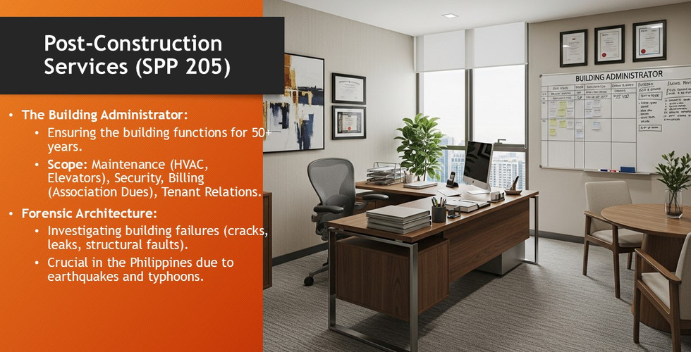 Professional practice extends into construction and post-construction phases. Architects often provide: